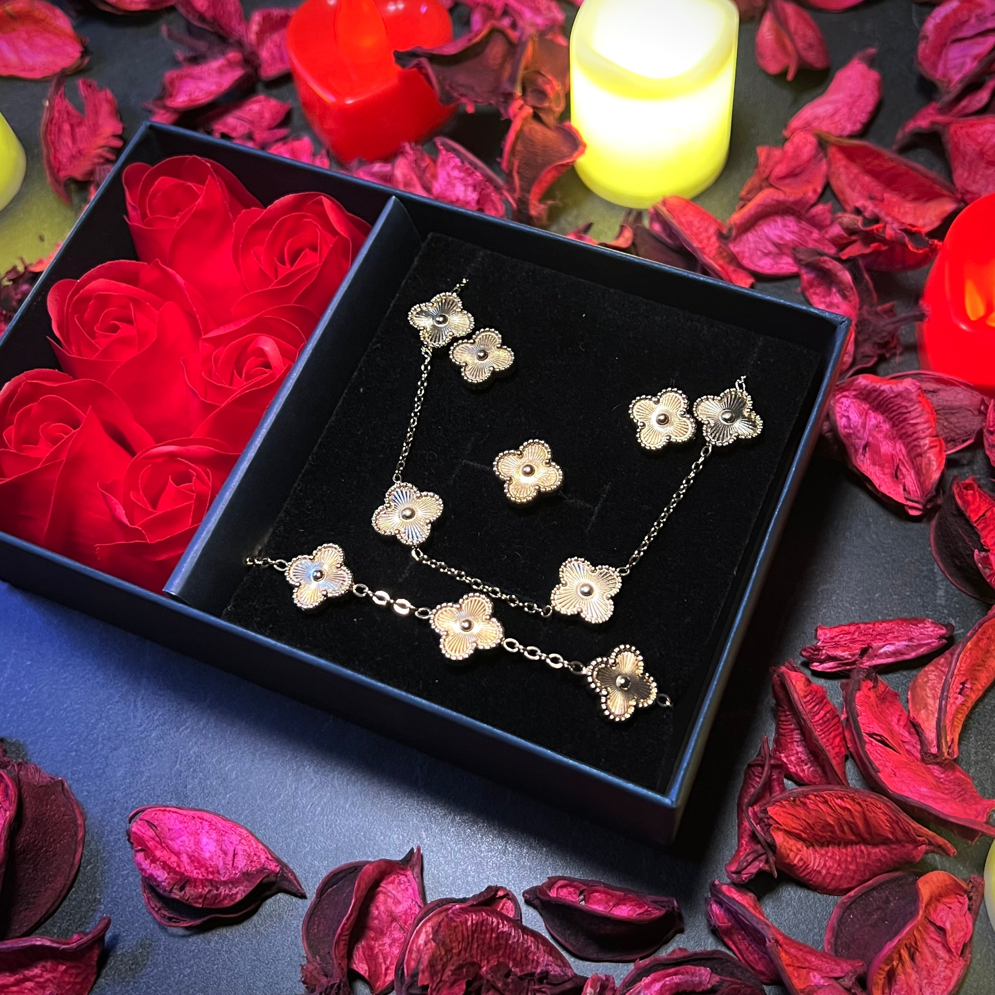 Un set que lo tiene TODO: collar, pulsera, aretes y anillo, en una elegante caja de rosas GRATIS 🌹